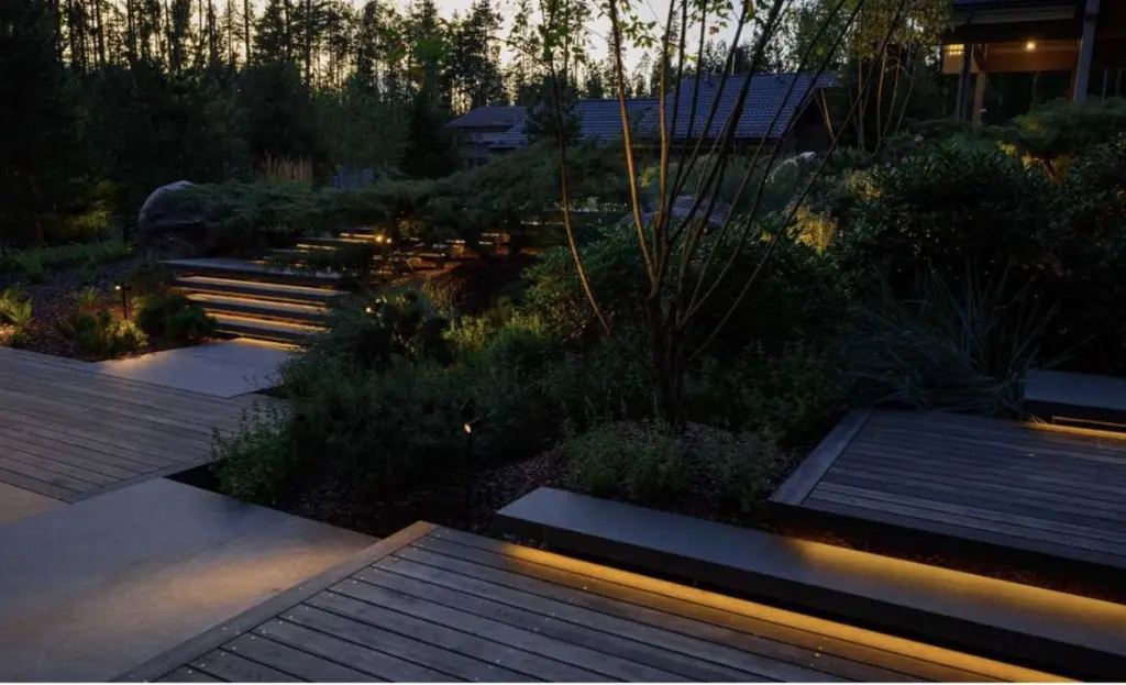 – paski LED wmontowane w elementy małej architektury lub nawierzchni. Często stosowane w nowoczesnych i minimalistycznych ogrodach, pięknie podkreślają szczególnie proste formy. Ich zastosowania może być różne, np. w zadaszeniu pergoli, elementach małej architektury, np. ławkach czy w tarasie.