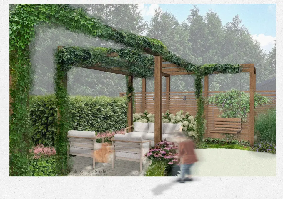 Ważnym elementem tego ogrodu jest pergola. Zaproponowałam inwestorom nowoczesną konstrukcję o lekkiej formie, która nie przytłacza całego ogrodu. Aby zapewnić prywatność i osłonę przed słońcem, pergole porasta pnącze. Nawierzchnia pod pergolą została zaplanowana z trawertynu, który jest niewymagającym w pielęgnacji materiałem.