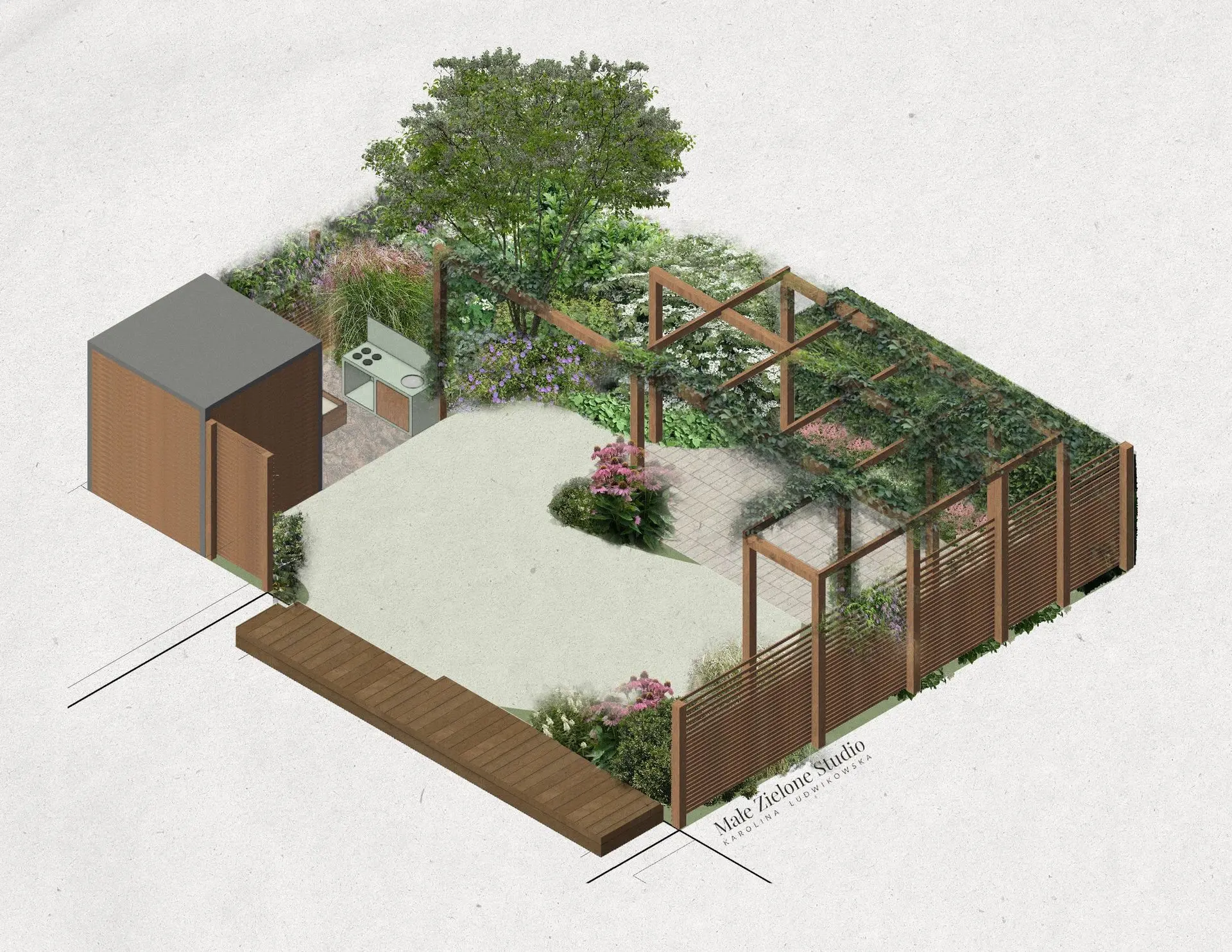 Styl ogrodu harmonijnie współgra z wnętrzem mieszkania dzięki zastosowaniu naturalnego drewna (w pergoli, ogrodzeniu i szopce) oraz stonowanych kolorów beżu i szarości w tarasie z trawertynu i meblach ogrodowych. Mały domek ogrodnika oferuje praktyczne miejsce do przechowywania.