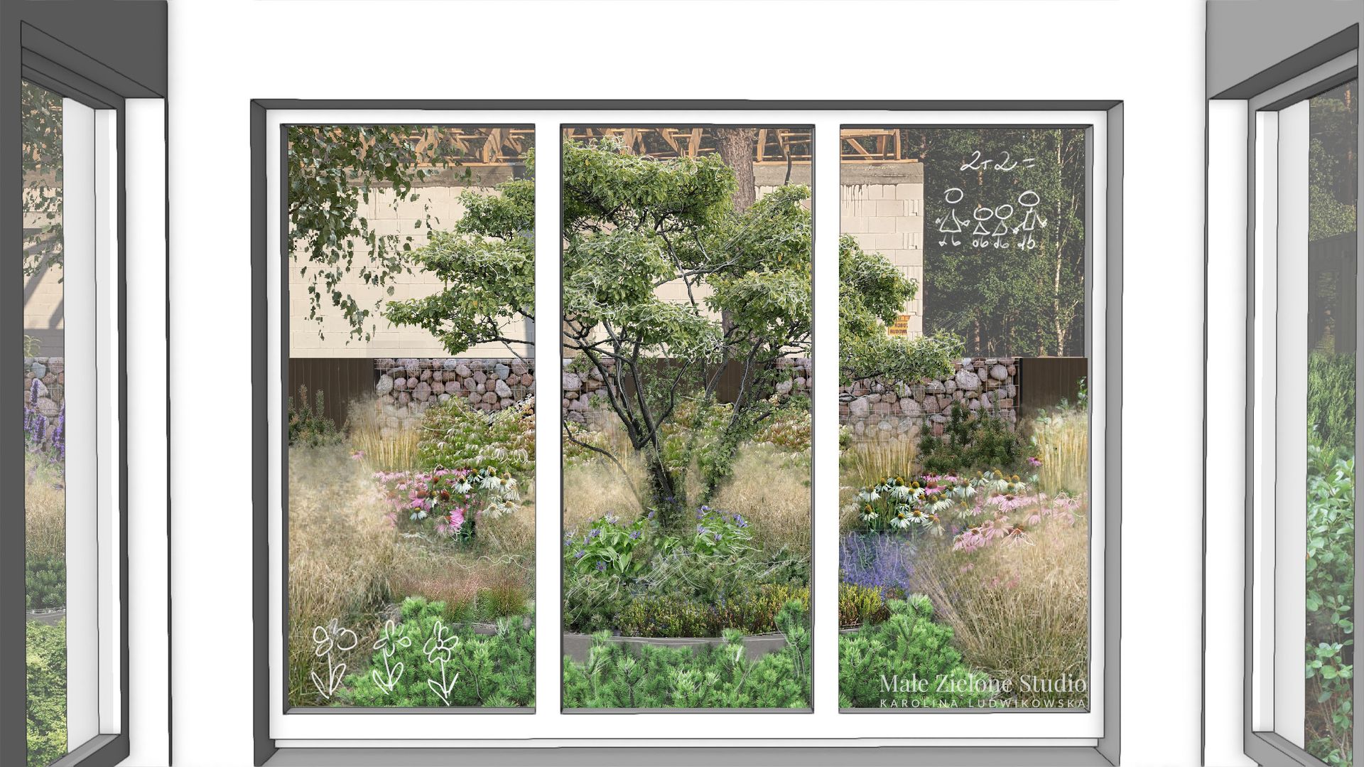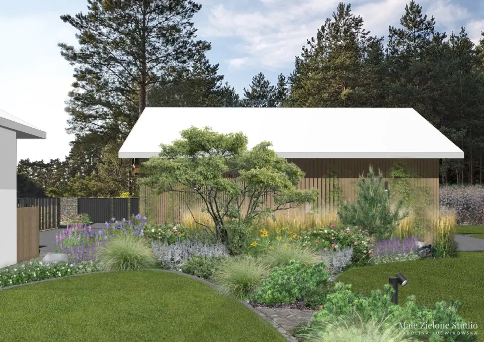 Główna strefa to przestronny trawnik z ozdobną rabatą. Z boku ogrodu znajduje się sauna oraz przytulne miejsce na relaks. Przy granicy z lasem umieściliśmy słupki na hamaki. W projekcie znalazły się dwa tarasy, jeden z kuchnią letnią i stołem, idealny do spożywania posiłków i grilowania, a drugi przy wyjściu na taras na wygodny wypoczynek i relaks z kawą. Dzięki lokalizacji miejsc wypoczynkowych w różnych częściach ogrodu możemy go podziwiać z wielu stron, co na pewno wzbogaca doświadczenia użytkowników, a ogród jest maksymalnie wykorzystywany. Z myślą o dzieciach planowany był cały ogród, ale ich specjalną strefę znajduje się za wiatą, gdzie zaplanowano plac zabaw w formie zewnętrznej siłowni oraz miejsce do gry w koszykówkę. To strefa dla aktywnych dzieci, a nawet i dla rodziców. Będzie rodzinie służyć przez wiele lat. Front ogrodu wyróżnia eleganckie ogrodzenie gabionowe i aluminiowe, wypełnione kamieniem polnym współgra z architekturą domu i sielskim klimatem otoczenia.. Przez pergolę można przejść do ogrodu warzywno-owocowego oraz głównego ogrodu. Cały ogród zachwyca nasadzeniami w stylu naturalistycznym i sezonowymi kompozycjami roślin. Dodatkowo, część trawników przeznaczyliśmy na łąkę kwietną.
